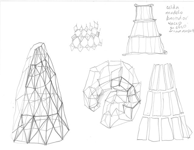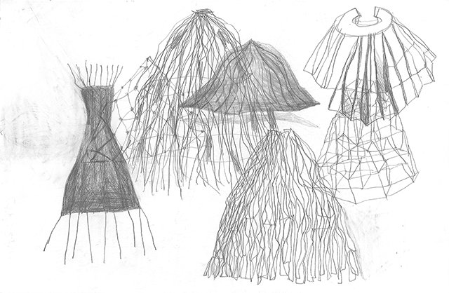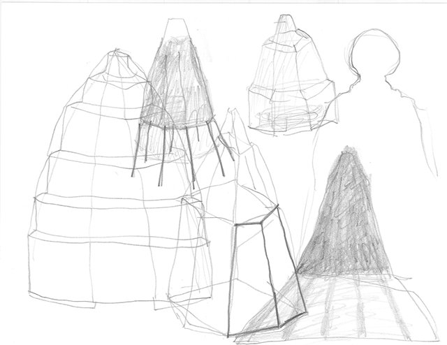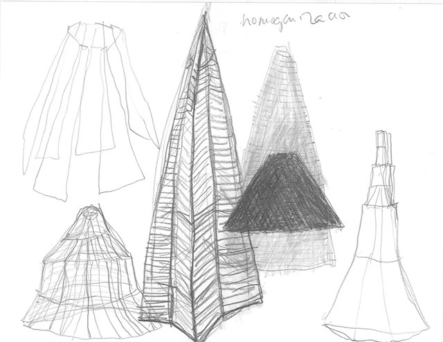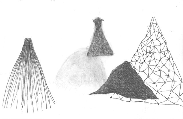 Usé la figura de la falda porque es una palabra que comparte la montaña con la pieza de vestimenta femenina. En esta serie de bocetos desarrollé paisajes a partir de formas cónicas que recuerdan las faldas. Estas formas me sirvieron de modelo para realizar piezas escultóricas en diferentes materiales que hacen parte de la serie En su Lugar.