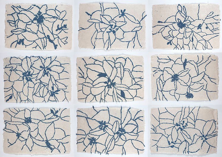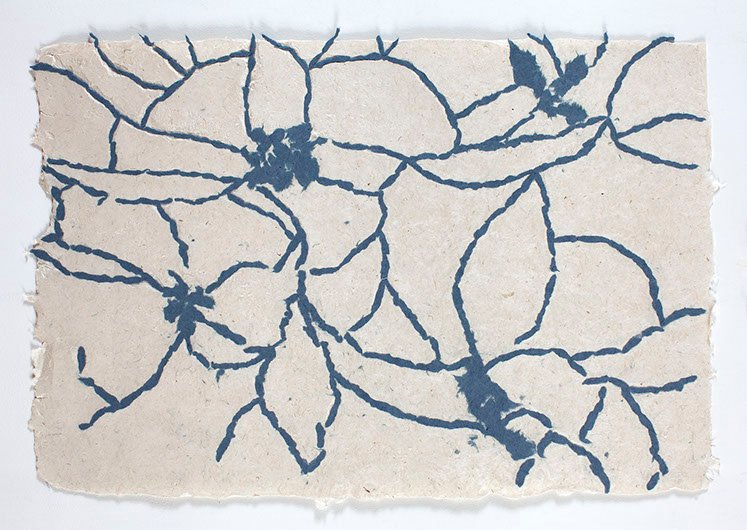 El proceso de elaboración es muy artesanal, está hecho con fibra de fique crudo y teñido con repollo morado, con lo que construí las formas de las ramas que se expanden también aleatoriamente en los rectángulos, que posteriormente se pasan a la prensa para convertirse en papel. El azar cumple una función muy importante porque la prensa deforma las líneas y la figuras de una manera que yo no puedo controlar.