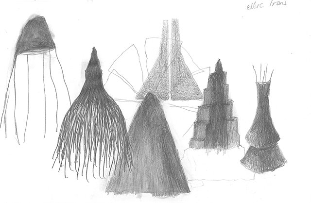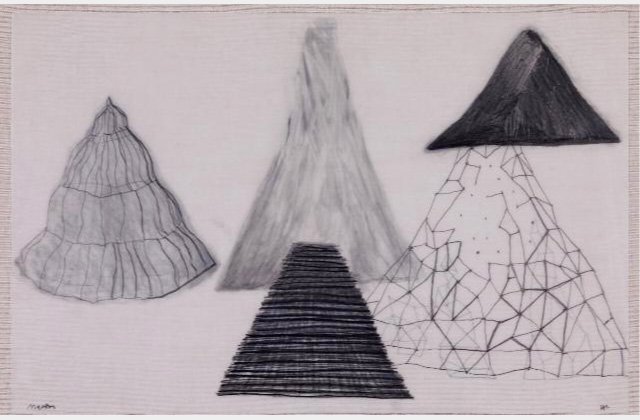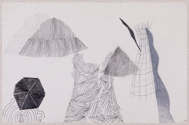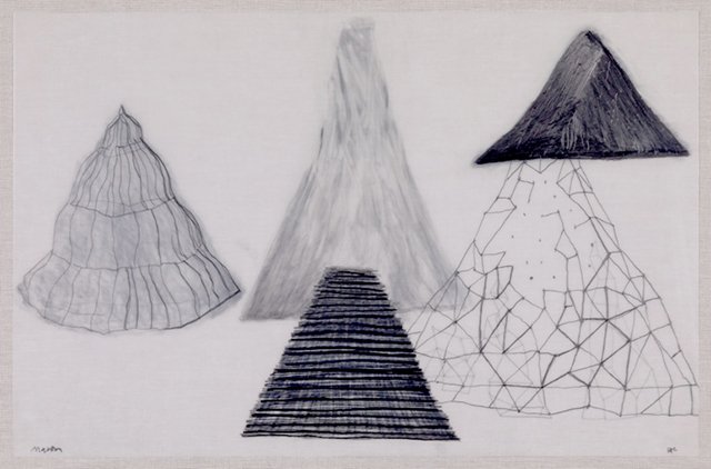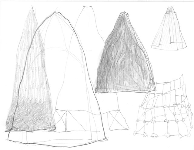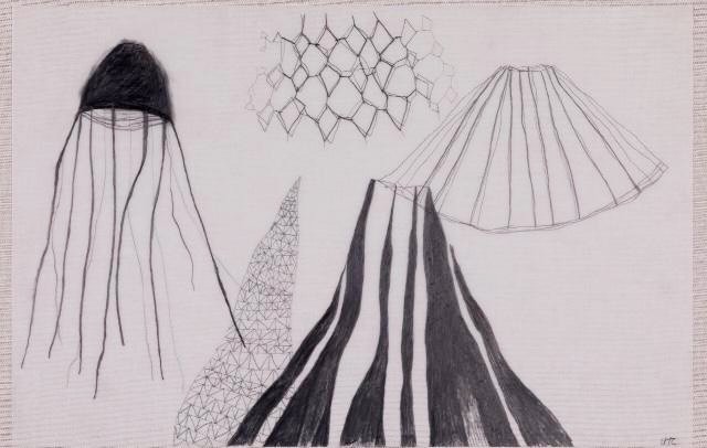 Usé la figura de la falda porque es una palabra que comparte la montaña con la pieza de vestimenta femenina. En esta serie de bocetos desarrollé paisajes a partir de formas cónicas que recuerdan las faldas. Estas formas me sirvieron de modelo para realizar piezas escultóricas en diferentes materiales que hacen parte de la serie En su Lugar.