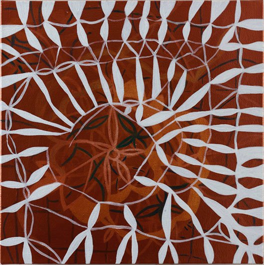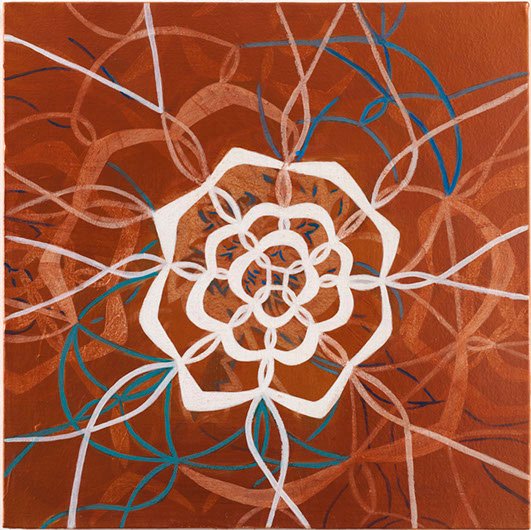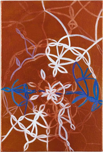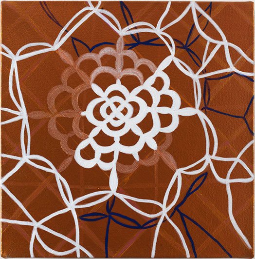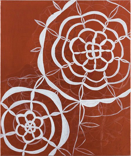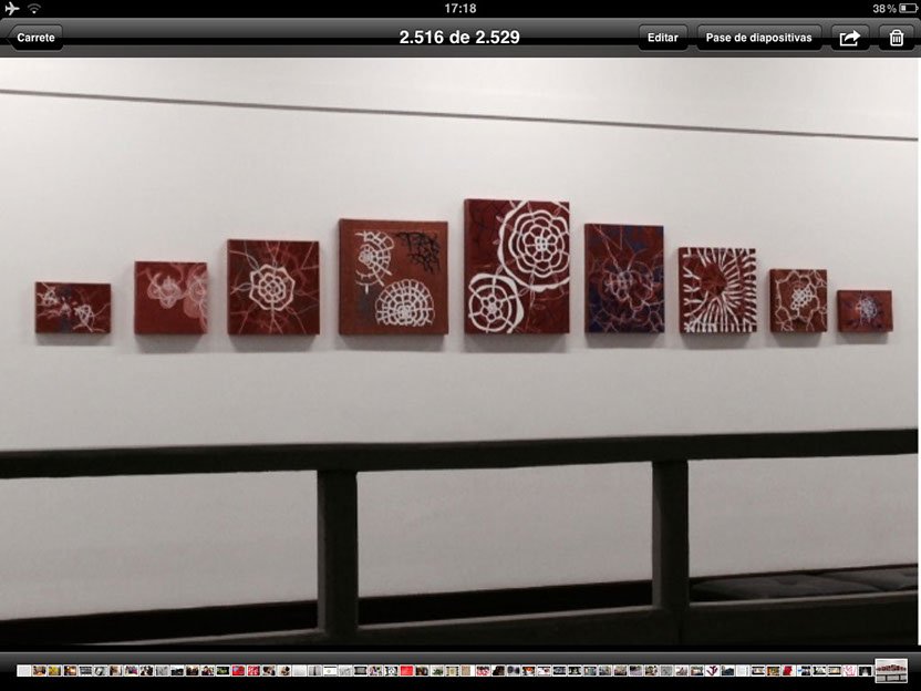 Es un grupo de 9 cuadros de diferentes formatos, desplegados en la pared en una linealidad que sugiere continuidad o temporalidad. El punto de partida es la pintura y la manera incierta como la enfrento: Una construcción basada en un pensamiento derivado del hacer manual, que en este caso lo represento asociado con un tipo de tejido conocido como “frivolidad” . Uso el tejido como un símil de la pintura, que para mi es el plano en que se cruzan diferentes pensamientos y experiencias, emociones y recuerdos, que se entretejen y se sueltan en una construcción siempre indefinida, inacabada e infinita.