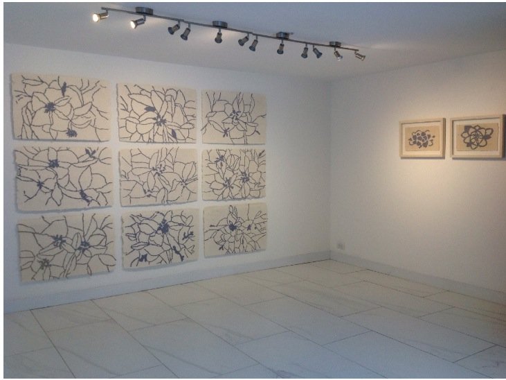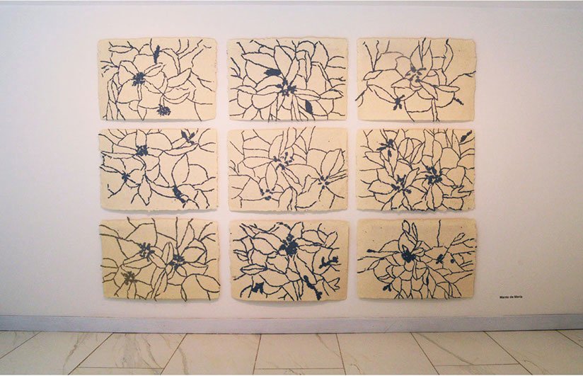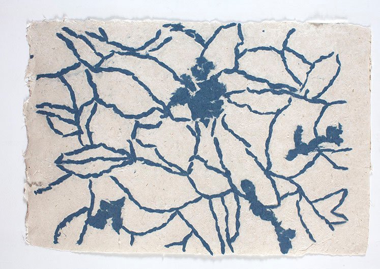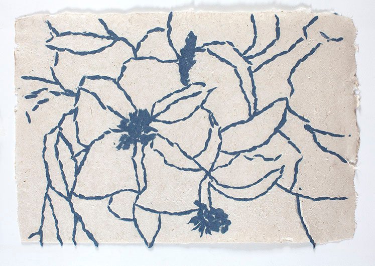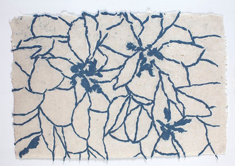 El proceso de elaboración es muy artesanal, está hecho con fibra de fique crudo y teñido con repollo morado, con lo que construí las formas de las ramas que se expanden también aleatoriamente en los rectángulos, que posteriormente se pasan a la prensa para convertirse en papel. El azar cumple una función muy importante porque la prensa deforma las líneas y la figuras de una manera que yo no puedo controlar.